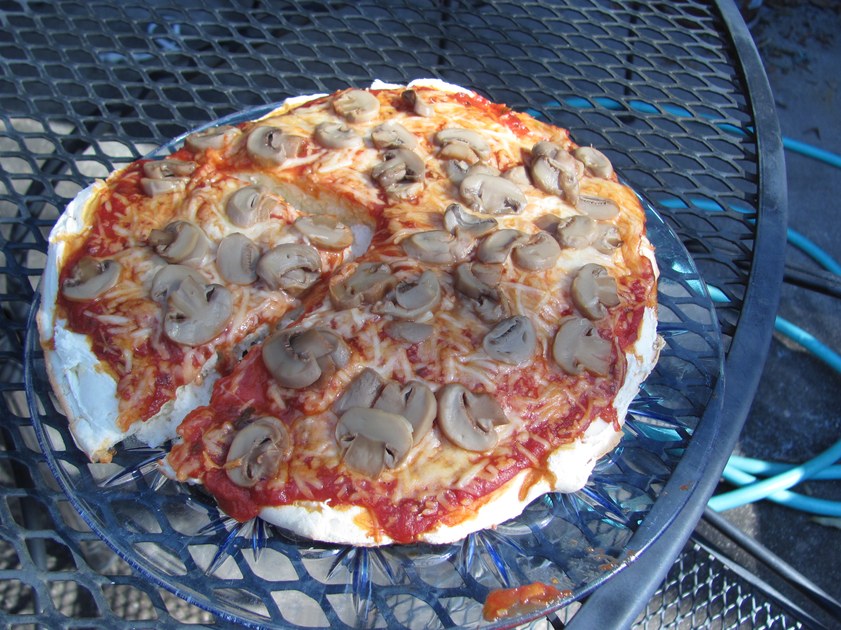 With a wooden spoon mix up the French bread and Pizza mix, water, cider vinegar, sugar, yeast, salt and eggs according to the package directions in your large mixing bowl. (Yes, it’s an arm workout. Mix for about ten minutes.) Preheat the oven to 450 degrees. Spray your cast iron pan liberally with Pam. Let the dough rise for 30 minutes and then take 1/3 of the bread recipe out of the mixing bowl and spread it thinly over the bottom of the cast iron pan. Add the tomato sauce, parmesan and other toppings. When the oven is ready, bake the pizza for twenty minutes or slightly more. Using a spatula, lift the cooling pizza out of the cast iron pan.