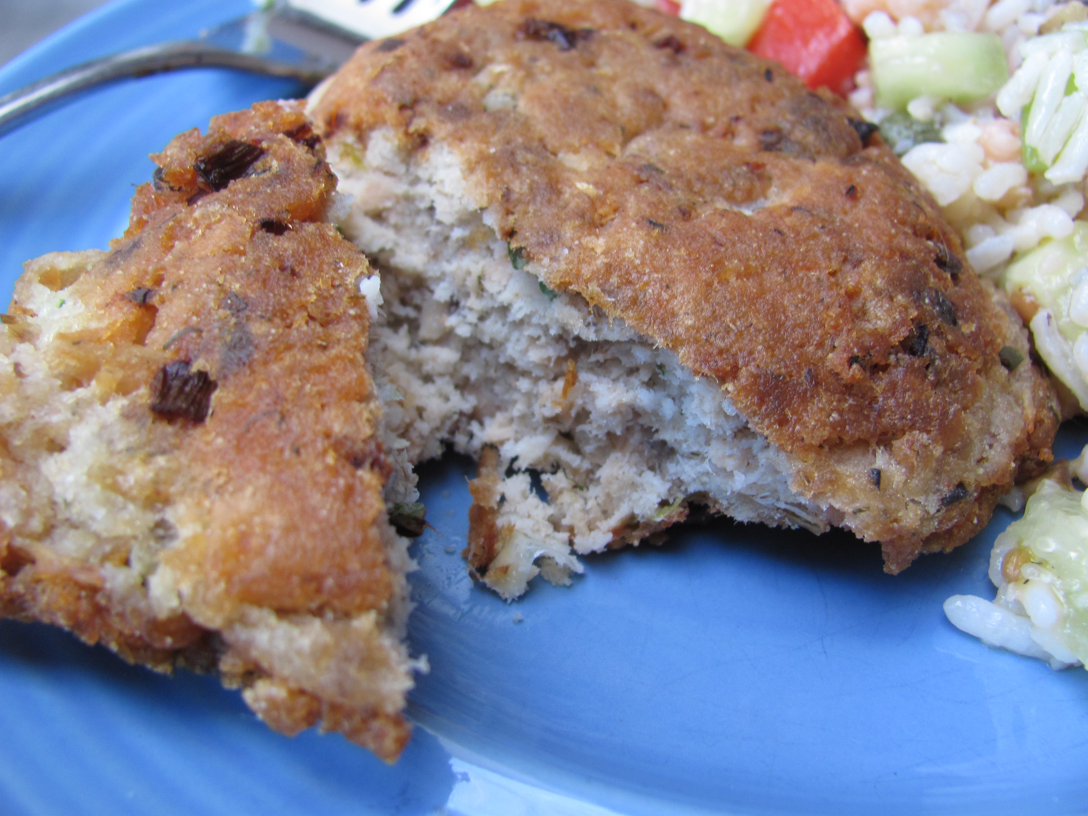 Measure and mix the flours, egg, and salmon in a mixing bowl. Add a teaspoon of water if it is too dry. (Maseca sucks up water, even from the air in your kitchen. If the air is dry, you’ll need a little more moisture to make it come together. In fact, this was an impromptu, “I think I’ll make up a recipe,” recipe. Halfway through I told K we’d be eating air for dinner, because it wouldn’t hold together. Then I got the bright idea to add more egg.) Once the dough is sticking together, put oil in your nonstick pan, and turn the heat to one notch above medium. When the oil starts to sizzle, take a fork and mound the salmon/onion/flour mixture into a patty in the bowl of your heat resistant spatula. Lower the patty into the oil, standing well back–water will make the oil splatter, some. Repeat for three more patties. Leave for six minutes, and then turn the patties, carefully. Let the salmon patties cook for five more minutes on the second side.